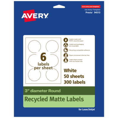 Stay environmentally conscious with Avery EcoFriendly Recycled Round Labels. These recycled products are made from 100% post-consumer recycled paper. These products are FSC certified to ensure the responsible use of resources from the world's forests. The label paper is also sourced responsibly to ensure the responsible use of resources from the world's forests. The paper is processed chlorine-free so that the number of harmful substances associated with the manufacturing process are substantially reduced. The label sheets are printed with soy-based inks that are derived from renewable materials. Avery EcoFriendly recycled stickers and labels are curbside recyclable with paper waste and use a recycling-compatible adhesive that won't interfere with the recycling process when adhered onto a paper substrate. The packaging is also recyclable and can be disposed of with paper waste. The print-to-the-edge layout lets you print all the way to the edge of the card. Personalize your own designs with the templates available on the Avery site and print with a laser or inkjet printer. Whether you're creating labels for the office, school, or home, Avery makes it easy to bring your designs to life. Please Note: The backing sheets of the labels are not recyclable and should be disposed of separately.