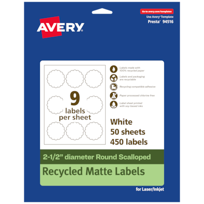 Stay environmentally conscious with Avery Matte White EcoFriendly Recycled Labels made from 100% post-consumer recycled paper. Stay environmentally conscious with Avery EcoFriendly Recycled Round Scalloped Labels. These recycled products are made from 100% post-consumer recycled paper. These products are FSC certified to ensure the responsible use of resources from the world's forests. The label paper is also sourced responsibly to ensure the responsible use of resources from the world's forests. The paper is processed chlorine-free so that the number of harmful substances associated with the manufacturing process are substantially reduced. The label sheets are printed with soy-based inks that are derived from renewable materials. Avery EcoFriendly recycled stickers and labels are curbside recyclable with paper waste and use a recycling-compatible adhesive that won't interfere with the recycling process when adhered onto a paper substrate. The packaging is also recyclable and can be disposed of with paper waste. The print-to-the-edge layout lets you print all the way to the edge of the card. Personalize your own designs with the templates available on the Avery site and print with a laser or inkjet printer. Whether you're creating labels for the office, school, or home, Avery makes it easy to bring your designs to life. Please Note: The backing sheets of the labels are not recyclable and should be disposed of separately.