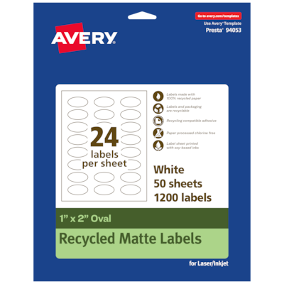 Stay environmentally conscious with Avery EcoFriendly Recycled Oval Labels. These recycled products are made from 100% post-consumer recycled paper. These products are FSC certified to ensure the responsible use of resources from the world's forests. The label paper is also sourced responsibly to ensure the responsible use of resources from the world's forests. The paper is processed chlorine-free so that the number of harmful substances associated with the manufacturing process are substantially reduced. The label sheets are printed with soy-based inks that are derived from renewable materials. Avery EcoFriendly recycled stickers and labels are curbside recyclable with paper waste and use a recycling-compatible adhesive that won't interfere with the recycling process when adhered onto a paper substrate. The packaging is also recyclable and can be disposed of with paper waste. The print-to-the-edge layout lets you print all the way to the edge of the card. Personalize your own designs with the templates available on the Avery site and print with a laser or inkjet printer. Whether you're creating labels for the office, school, or home, Avery makes it easy to bring your designs to life. Please Note: The backing sheets of the labels are not recyclable and should be disposed of separately.