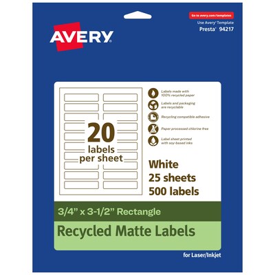 Avery EcoFriendly Laser/Inkjet Rectangle Multipurpose Labels, 3/4" x 3-1/2", White, 500/Pack (94217)