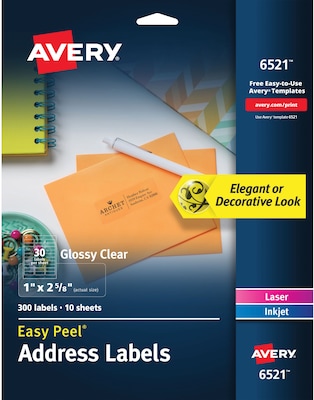 Avery Glossy Clear Easy Peel Address Labels, 1" x 2-5/8", Pack of 300 (06521)