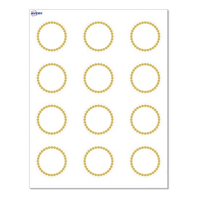 Pre-printed with beautiful designs, Avery Round 2" Diameter Matte White Cards with the Gold Beads Design help save ink and also elevate your branding and events. Pre-designed and printed with metallic gold ink with high-quality printers, these shiny patterns will definitely stand out and are not easily achieved with desktop printers. These pre-printed embellishments also help save your printer ink so that you only need to print your customizable information. Mix and match these cards with other Avery products from the same collection that have the same pre-printed design to create a cohesive look. Made with durable 80 lbs / 216 gsm cardstock with microperforated edges, these cards are great for creating double-sided thank you cards, round printable cards, round notes, and more. The versatile matte white material is a great solution for any project. Compatible with both laser and inkjet printers, these cards make it a breeze to personalize them with your own information with a desktop printer while still looking professional. Sure Feed technology reduces printer jams by creating a more reliable feed through your printer. Easily customize gold wedding cards, luxury holiday event cards, premium event cards, festive gold cards, and more with your own logos, text, and designs by searching for the Presta ID S00-D1K and using the templates and tools in Avery Design & Print on the Avery site. Whether you’re a business owner that wants to add more flair to products, an event planner looking to elevate an event, or a teacher looking to step up class projects, Avery cards make it easy to translate your designs into reality.