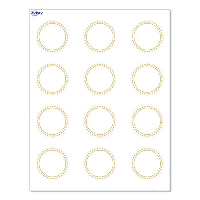 Pre-printed with beautiful designs, Avery Round 2" Diameter Matte White Cards with the Gold Border with Gold Dots Design help save ink and also elevate your branding and events. Pre-designed and printed with metallic gold ink with high-quality printers, these shiny patterns will definitely stand out and are not easily achieved with desktop printers. These pre-printed embellishments also help save your printer ink so that you only need to print your customizable information. Mix and match these cards with other Avery products from the same collection that have the same pre-printed design to create a cohesive look. Made with durable 80 lbs / 216 gsm cardstock with microperforated edges, these cards are great for creating double-sided thank you cards, round printable cards, round notes, and more. The versatile matte white material is a great solution for any project. Compatible with both laser and inkjet printers, these cards make it a breeze to personalize them with your own information with a desktop printer while still looking professional. Sure Feed technology reduces printer jams by creating a more reliable feed through your printer. Easily customize gold wedding cards, luxury holiday event cards, premium event cards, festive gold cards, and more with your own logos, text, and designs by searching for the Presta ID S00-D1E and using the templates and tools in Avery Design & Print on the Avery site. Whether you’re a business owner that wants to add more flair to products, an event planner looking to elevate an event, or a teacher looking to step up class projects, Avery cards make it easy to translate your designs into reality.