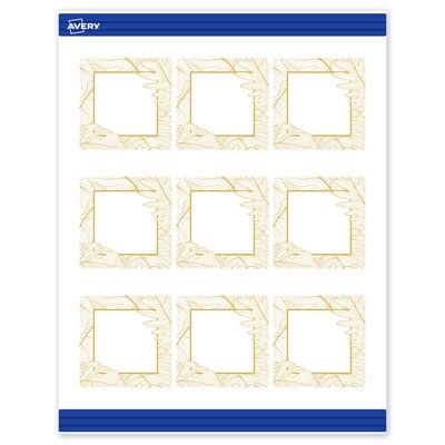 Add an elevated, professional touch to your branding or event with Avery(R) Square 2-1/2" x 2-1/2" Matte White Business Cards featuring the Gold Monstera Leaves design. These premium cards are pre-printed with elegant, metallic gold accents that standard desktop printers simply can't replicate, giving your business or event an instant upgrade. With a design already pre-printed, you can easily customize the blank space while using less ink—just personalize and print. For a cohesive look, pair these business cards with other Avery(R) products in the same design collection. Made with sturdy 80 lbs / 216 gsm cardstock and micro-perforated edges, these customizable cards feature a pre-printed design on one side and can be personalized on both sides for full customization. The smooth matte white finish delivers clean, versatile results that work beautifully across a wide range of projects. Compatible with laser and inkjet printers, these cards make it easy to print personalized business cards with professional results. Built-in Sure Feed(R) technology is designed to provide a more reliable feed through your printer, helping to reduce misalignments, printer jams, and wasted product. Search Avery Presta(R) Template S00-EW3, and use Avery(R) Design & Print to add your own logo, text, and artwork. Our easy-to-use design software lets you add your own personal touch while enjoying the consistency of the stunning, pre-printed design.