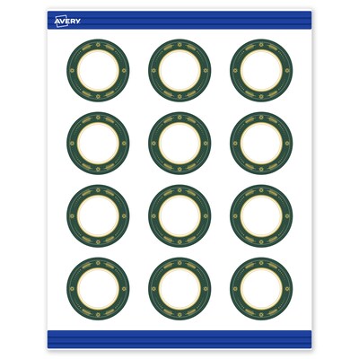 Add festive fun to branding and events with Avery(R) 2" Diameter Round Holiday Round Cards featuring the Green Border with Gold Scalloped Frame design. Elevate your business or event with these premium, printable round cards that feature a pre-printed border with elegant metallic accents, delivering a look no standard desktop printer can match. With a design already pre-printed, you can easily customize the blank space while using less ink—just personalize and print. For a cohesive look, pair these holiday round cards with other Avery(R) products in the same design collection. Made with sturdy 80 lbs / 216 gsm cardstock and micro-perforated edges, these customizable cards feature a pre-printed design on one side and can be personalized on both sides for full customization. The smooth matte white finish delivers clean, versatile results that work beautifully across a wide range of projects. Sure Feed(R) technology helps reduce misalignments and printer jams by creating a more reliable feed through your printer. Compatible with laser and inkjet printers, you can easily print wedding favor cards, table number cards, Christmas business cards, and more with professional results. Just use Avery(R) Design & Print and search Avery Presta(R) Template S00-FDK to add your own logo, text, and artwork for a personal touch.