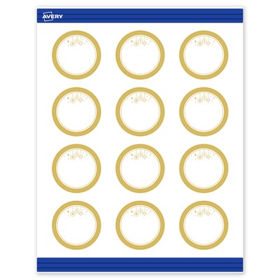 Add festive fun to branding and events with Avery(R) 2" Diameter Round Holiday Round Cards featuring the Metallic Gold Scalloped Border with Hanging Ornaments design. Elevate your business or event with these premium, printable round cards that feature a pre-printed border with elegant metallic accents, delivering a look no standard desktop printer can match. With a design already pre-printed, you can easily customize the blank space while using less ink—just personalize and print. For a cohesive look, pair these holiday round cards with other Avery(R) products in the same design collection. Made with sturdy 80 lbs / 216 gsm cardstock and micro-perforated edges, these customizable cards feature a pre-printed design on one side and can be personalized on both sides for full customization. The smooth matte white finish delivers clean, versatile results that work beautifully across a wide range of projects. Sure Feed(R) technology helps reduce misalignments and printer jams by creating a more reliable feed through your printer. Compatible with laser and inkjet printers, you can easily print wedding favor cards, table number cards, Christmas business cards, and more with professional results. Just use Avery(R) Design & Print and search Avery Presta(R) Template S00-FH7 to add your own logo, text, and artwork for a personal touch.