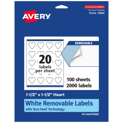Add an elegant touch to home organization labels, price labels, reward stickers, decorative labels, mailing seals, product labels, planner stickers and more with Avery 1.5" x 1.5" Matte White Removable Heart Labels. Made with matte white paper and removable adhesive, the removable Avery labels stick and stay but remove cleanly. Apply these removable white labels to smooth surfaces such as paper, plastic, cardboard, glass, or metal and peel them away without leaving behind messy residue. Avery heart labels are carefully constructed with patented features to provide the best results. Sure Feed technology reduces jams or smudges by creating a more reliable feed through your printer. The print-to-the-edge layout lets you print beautiful full-bleed designs that fill each blank sticker to the edge. The dual-compatible printable labels are compatible with both laser printers and inkjet printers. Easily customize labels with your own designs, art, symbols, and messaging in Avery Design & Print. Whether you’re looking for labels to help organize your home, labels for a school project or product labels that will grab people’s attention, Avery Matte White Removable Labels are the perfect choice for any project.