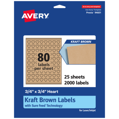 Easily add a rustic finish to crafts, gifts and products with Avery .75" x .75" Kraft Brown Heart Labels. Made with a kraft brown paper material that’s smooth to the touch, Avery kraft brown labels add a natural and handcrafted look to any project. This charming kraft brown material is perfect for adding a little homespun flair to reward stickers, decorative labels, mailing seals, product labels, planner stickers and more. Avery heart labels are carefully constructed and developed with patented features to provide the best results for every project. Sure Feed technology prevents jams or smudges by creating a more reliable feed through your printer. The print-to-the-edge layout lets you print beautiful full-bleed designs that fill each blank sticker to the edge. The strong permanent label adhesive makes sure that your labels stick and stay to a variety of surfaces without peeling, curling or falling off. Easily customize labels with your own designs, art, symbols and messaging by using the label templates and designs on the Avery website. The intuitive tools make it easy to add your personal touch to any project.