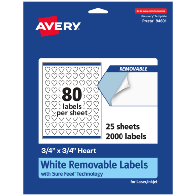 Add an elegant touch to home organization labels, price labels, reward stickers, decorative labels, mailing seals, product labels, planner stickers and more with Avery .75" x .75" Matte White Removable Heart Labels. Made with matte white paper and removable adhesive, the removable Avery labels stick and stay but remove cleanly. Apply these removable white labels to smooth surfaces such as paper, plastic, cardboard, glass, or metal and peel them away without leaving behind messy residue. Avery heart labels are carefully constructed with patented features to provide the best results. Sure Feed technology reduces jams or smudges by creating a more reliable feed through your printer. The print-to-the-edge layout lets you print beautiful full-bleed designs that fill each blank sticker to the edge. The dual-compatible printable labels are compatible with both laser printers and inkjet printers. Easily customize labels with your own designs, art, symbols, and messaging in Avery Design & Print. Whether you’re looking for labels to help organize your home, labels for a school project or product labels that will grab people’s attention, Avery Matte White Removable Labels are the perfect choice for any project.