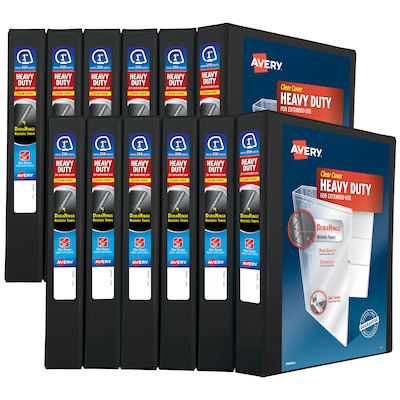 This Heavy-Duty View Binder with One Touch rings is perfect for extended use. From everyday referencing to classroom notes and home business use, -this binder's strong enough to handle them all. The DuraHinge(R) design is stronger, lasts longer and resists tearing, while the DuraEdge(R) feature makes the sides and top more pliable to resist splitting. Our deep texture film offers a smoother finish and features a linen pattern for high quality look and feel. Just pull the lever to open the rings for adding, replacing and removing pages. Then push to lock the rings in place. Even when filled to its 275-page capacity, this binder still has four stacked pockets for a bit of extra space inside. Customize the black cover with free, easy-to-use templates and designs at avery.com/print.