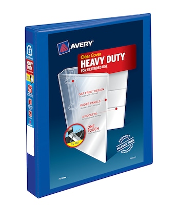 With this Heavy-Duty Binder you get one-touch operation and everyday durability. The DuraHinge(R) design is stronger, lasts longer and resists tearing, while the DuraEdge(R) feature makes the sides and top more pliable to resist splitting. A deep texture film offers a smoother finish and features a linen pattern for high-quality look and feel. The exclusive EZD(R) rings open and lock closed with one touch, and hold more sheets than the same size slant and round rings. Also, the rings' gap-free design keeps your papers secure so they won't fall out. Even when filled to its 275-page capacity, this binder has four stacked pockets for extra space inside the covers. The pacific blue binder is made with a nonstick poly construction for maximum performance, and features wider front and back panels cover standard size dividers and sheet protectors.