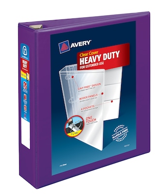This Heavy-Duty View Binder with One Touch rings is perfect for extended use. From everyday referencing to classroom notes and home business use-this binder's strong enough to handle them all. The DuraHinge(R) design is stronger, lasts longer and resists tearing, while the DuraEdge(R) feature makes the sides and top more pliable to resist splitting. Our deep texture film offers a smoother finish and features a linen pattern for high quality look and feel. Just pull the lever to open the rings for adding, replacing and removing pages. Then push to lock the rings in place. Even when filled to its 540-page capacity, this binder still has four stacked pockets for a bit of extra space inside. Customize the purple cover with free, easy-to-use templates and designs at avery.com/print.