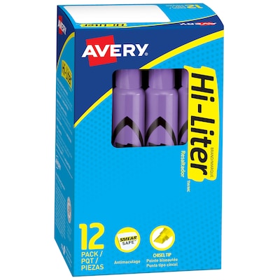 Prepare notes for studying or research with these desk-style highlighters The bright purple ink stands out on the page, while the chisel tips let you create fine or broad lines. These Avery Hi-Liter chisel-tip highlighters feature washable ink, preventing stains and messes.
