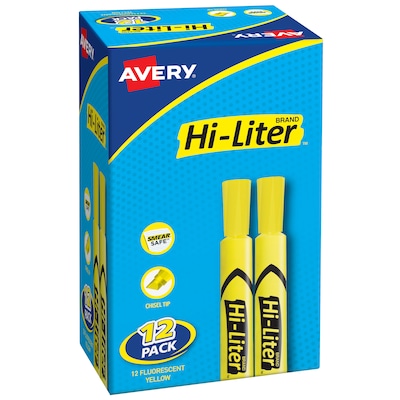 Study research materials, prepare documents or call attention to important information with these desk-style highlighters. The nontoxic ink is ideal for use in classrooms and offices, while the bright yellow color stands out for better visibility. These Avery Hi-Liter highlighters feature chisel tips, so you can create fine or broad lines.