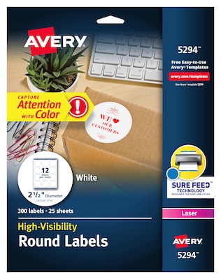 Avery High Visibility Laser Shipping Labels, 2.5"Dia., White, 300/Pack (5294)