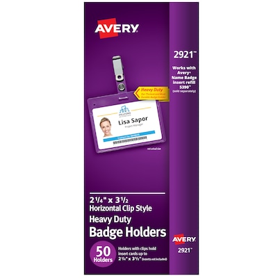 Have your staff ID cards, name tags, access control cards or visitor passes visible and accessible with these heavy-duty name badge holders with clips. Ideal for permanent or temporary identification, these reusable 2.25" x 3.5" horizontal name badge holders are made from PVC heavyweight plastic that is durable enough for everyday use. Perfect for use as a CNA name badge holder, RN name badge holder, employee ID holder and more. The convenient Secure Top design ensures cards, name badges or other inserts stay secure within the holder, while the garment-friendly clip attaches to clothing without damaging fabric. These badge card holders are also compatible with Avery Badge Inserts 5390 (inserts sold separately), making them great for custom name tags, volunteer badges, name tags for kids and more. Use these versatile badge holders at the office, jobsite or corporate event, for the classroom or school field trip, at conventions or trade shows, or even at your next reunion, party or big family get-together. Item comes with 50 plastic badge holders with clips. Please Note: PVC plastic is smudge-resistant with a variety of inks but can potentially smear if used with laser-printed toner.