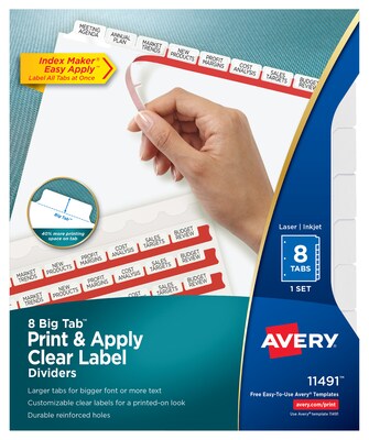 Don't waste time and money ordering custom printed binder dividers with tabs when you can easily create and print your own personalized dividers with Avery Index Maker Clear Label Big Tab Dividers. Our larger Big Tab design offers more room for bigger fonts, more text and even logos or images. Customize your title tabs quickly and easily using the free templates on the Avery website and print with your inkjet or laser printer for clean, professional looking results in minutes. This pack comes with one set of 8-tab dividers, and the Easy Apply clear label strips make it simple to apply all 8 labels at once. Just print, align labels against tabs, smooth down labels and peel up strip. Each 3-hole punched durable divider also features doubled-sided, reinforced tabs and edges to help resist tearing for long-lasting, everyday use. These 3 ring binder dividers with tabs are a great addition to your medical office supplies, school binders, personal organizers, tax office supplies, presentation reports and more. Print, peel, and press your way to a perfect, precise project.