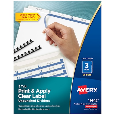 Don't waste time and money ordering custom printed binder dividers with tabs for your bound documents when you can easily create and print your own personalized dividers with Avery Index Maker Clear Label Unpunched Dividers. The unpunched edge of these dividers can accommodate all binding styles, making them perfect for finance reports, curriculum notebooks, medical guides, business plans and more. Customize your title tabs quickly and easily using the free templates on the Avery website and print with your inkjet or laser printer for clean, professional looking results in minutes. This pack comes with 25 sets of 3-tab dividers, and the Easy Apply clear label strips make it simple to apply all 3 labels of each set at once. Just print, align labels against tabs, smooth down labels and peel up strip. Each durable divider also features doubled-sided, reinforced tabs to help resist tearing. These binder dividers with tabs are a great addition to your medical office supplies, personal organizers, tax office supplies, presentation reports and more. Print, peel, and press your way to a perfect, precise project.