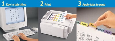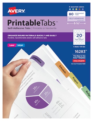 Get into a sticky situation you won't want to get out of with Avery Printable Self-Adhesive Tabs. Quickly and easily create custom binder dividers with tabs to quickly and easily organize bound reports, reference manuals, personal organizers and more. Use the free templates and designs available on the Avery site to format the divider tabs for printing on your laser or inkjet printer, or personalize them by hand by writing on them directly with a pencil, pen, marker or highlighter. The self-adhesive plastic divider tabs are repositionable when applied, allowing for a bit of experimentation to find just the right spot. Over time, the adhesive becomes permanent, proving these tabs will stick by you for the long term. Great for personal organization projects at home, work or school, these self-adhesive tabs work great with tabbed dividers and file folders to keep your reports, records, photos and important documents in order.