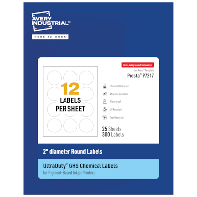 Avery Inkjet Round UltraDuty GHS Labels, 2" Dia., White, 300 Labels/Pack (97217)