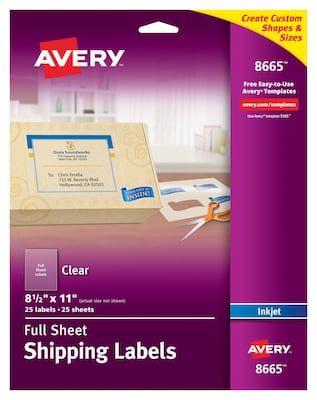 Add neat, professional labels to packages, gifts, mail, invitations or crafts with this 25-count box of Avery clear shipping labels. The clear labels are almost invisible over colored or textured surfaces, and each label can be cut or shaped to fit your projects. Customize these Avery matte clear shipping labels using an inkjet printer and Avery templates or designs.