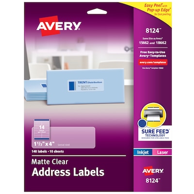 Avery Laser/Inkjet Address Labels, 1-1/3" x 4", Matte Clear, 140 Labels/Pack (8124)