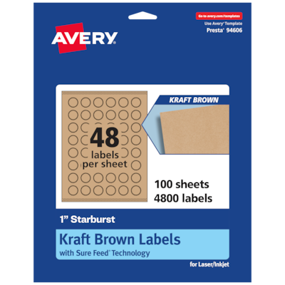 Easily add a rustic finish to crafts, gifts and products with Avery 1" Kraft Brown Starburst Labels. Made with a kraft brown paper material that’s smooth to the touch, Avery kraft brown labels add a natural and handcrafted look to any project. This charming kraft brown material is perfect for adding a little homespun flair to reward stickers for kids, certificate seals, decorative labels, mailing seals, planner stickers and more. Avery starburst labels are carefully constructed and developed with patented features to provide the best results for every project. Sure Feed technology prevents jams or smudges by creating a more reliable feed through your printer. The print-to-the-edge layout lets you print beautiful full-bleed designs that fill each blank sticker to the edge. The strong permanent label adhesive makes sure that your labels stick and stay to a variety of surfaces without peeling, curling or falling off. Easily customize labels with your own designs, art, symbols and messaging by using the label templates and designs on the Avery website. The intuitive tools make it easy to add your personal touch to any project.