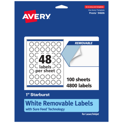 Add an elegant touch to home organization labels, price labels, reward stickers for kids, certificate seals, decorative labels, mailing seals, planner stickers and more with Avery 1" Matte White Removable Starburst Labels. Made with matte white paper and removable adhesive, the removable Avery labels stick and stay but remove cleanly. Apply these removable white labels to smooth surfaces such as paper, plastic, cardboard, glass, or metal and peel them away without leaving behind messy residue. Avery starburst labels are carefully constructed with patented features to provide the best results. Sure Feed technology reduces jams or smudges by creating a more reliable feed through your printer. The print-to-the-edge layout lets you print beautiful full-bleed designs that fill each blank sticker to the edge. The dual-compatible printable labels are compatible with both laser printers and inkjet printers. Easily customize labels with your own designs, art, symbols, and messaging in Avery Design & Print. Whether you’re looking for labels to help organize your home, labels for a school project or product labels that will grab people’s attention, Avery Matte White Removable Labels are the perfect choice for any project.
