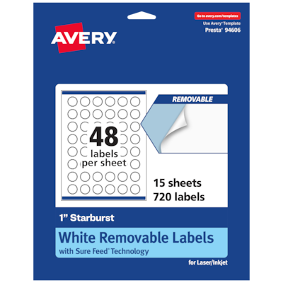 Add an elegant touch to home organization labels, price labels, reward stickers for kids, certificate seals, decorative labels, mailing seals, planner stickers and more with Avery 1" Matte White Removable Starburst Labels. Made with matte white paper and removable adhesive, the removable Avery labels stick and stay but remove cleanly. Apply these removable white labels to smooth surfaces such as paper, plastic, cardboard, glass, or metal and peel them away without leaving behind messy residue. Avery starburst labels are carefully constructed with patented features to provide the best results. Sure Feed technology reduces jams or smudges by creating a more reliable feed through your printer. The print-to-the-edge layout lets you print beautiful full-bleed designs that fill each blank sticker to the edge. The dual-compatible printable labels are compatible with both laser printers and inkjet printers. Easily customize labels with your own designs, art, symbols, and messaging in Avery Design & Print. Whether you’re looking for labels to help organize your home, labels for a school project or product labels that will grab people’s attention, Avery Matte White Removable Labels are the perfect choice for any project.