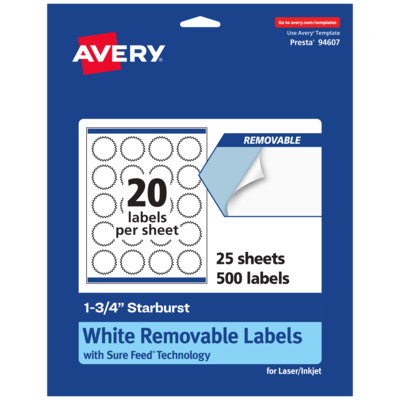 Add an elegant touch to home organization labels, price labels, reward stickers for kids, certificate seals, decorative labels, mailing seals, planner stickers and more with Avery 1.75" Matte White Removable Starburst Labels. Made with matte white paper and removable adhesive, the removable Avery labels stick and stay but remove cleanly. Apply these removable white labels to smooth surfaces such as paper, plastic, cardboard, glass, or metal and peel them away without leaving behind messy residue. Avery starburst labels are carefully constructed with patented features to provide the best results. Sure Feed technology reduces jams or smudges by creating a more reliable feed through your printer. The print-to-the-edge layout lets you print beautiful full-bleed designs that fill each blank sticker to the edge. The dual-compatible printable labels are compatible with both laser printers and inkjet printers. Easily customize labels with your own designs, art, symbols, and messaging in Avery Design & Print. Whether you’re looking for labels to help organize your home, labels for a school project or product labels that will grab people’s attention, Avery Matte White Removable Labels are the perfect choice for any project.