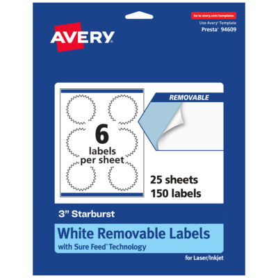 Add an elegant touch to home organization labels, price labels, reward stickers for kids, certificate seals, decorative labels, mailing seals, planner stickers and more with Avery 3" Matte White Removable Starburst Labels. Made with matte white paper and removable adhesive, the removable Avery labels stick and stay but remove cleanly. Apply these removable white labels to smooth surfaces such as paper, plastic, cardboard, glass, or metal and peel them away without leaving behind messy residue. Avery starburst labels are carefully constructed with patented features to provide the best results. Sure Feed technology reduces jams or smudges by creating a more reliable feed through your printer. The print-to-the-edge layout lets you print beautiful full-bleed designs that fill each blank sticker to the edge. The dual-compatible printable labels are compatible with both laser printers and inkjet printers. Easily customize labels with your own designs, art, symbols, and messaging in Avery Design & Print. Whether you’re looking for labels to help organize your home, labels for a school project or product labels that will grab people’s attention, Avery Matte White Removable Labels are the perfect choice for any project.