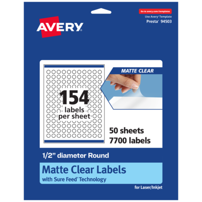 Create frosted clear pricing labels, product labels, wedding and party favor labels, mailing seals, thank you labels, ingredient labels, barcode labels, and more with Avery 1/2" Diameter Matte Clear Round Labels. The soft, translucent material of Avery Clear Labels is perfect for creating clear labels that blend seamlessly into lighter-colored objects and surfaces. The slightly frosted appearance also helps provide contrast to make sure your print stays legible. Avery round labels are carefully constructed with patented features to provide the best results. Sure Feed technology reduces jams and smudges by creating a more reliable feed through your printer. The print-to-the-edge layout lets you print beautiful full-bleed designs that fill each blank sticker to the edge. The patented Easy Peel label design makes these labels easy to peel and quick to apply. Just bend the label sheet, peel off your labels and fold the sheet back flat. The strong permanent label adhesive makes sure that your labels stick and stay to a variety of surfaces without peeling, curling or falling off. Easily customize labels with your own designs, art, symbols, and messaging by using the label templates and designs on the Avery website.