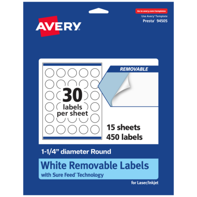 Add an elegant touch to home organization labels, price labels, mailing seals, candle labels, pricing labels, soap labels, product labels, round spice labels, mason jar labels and more with Avery 1.25" diameter Matte White Removable Round Labels. Made with matte white paper and removable adhesive, the removable Avery labels stick and stay but remove cleanly. Apply these removable white labels to smooth surfaces such as paper, plastic, cardboard, glass, or metal and peel them away without leaving behind messy residue. Avery round labels are carefully constructed with patented features to provide the best results. Sure Feed technology reduces jams or smudges by creating a more reliable feed through your printer. The print-to-the-edge layout lets you print beautiful full-bleed designs that fill each blank sticker to the edge. The Pop-Up Edge lets you fold the sheet back to pop up the edges of each label for faster peeling. The dual-compatible printable labels are compatible with both laser printers and inkjet printers. Easily customize labels with your own designs, art, symbols, and messaging in Avery Design & Print.