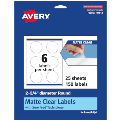 Create frosted clear product labels, soap labels, candle labels, perfume labels, wedding and party favor labels, food & beverage labels, thank you labels, and more with Avery 2-3/4" Diameter Matte Clear Round Labels. The soft, translucent material of Avery Clear Labels is perfect for creating clear labels that blend seamlessly into lighter-colored objects and surfaces. The slightly frosted appearance also helps provide contrast to make sure your print stays legible. Avery round labels are carefully constructed with patented features to provide the best results. Sure Feed technology reduces jams and smudges by creating a more reliable feed through your printer. The print-to-the-edge layout lets you print beautiful full-bleed designs that fill each blank sticker to the edge. The patented Easy Peel label design makes these labels easy to peel and quick to apply. Just bend the label sheet, peel off your labels and fold the sheet back flat. The strong permanent label adhesive makes sure that your labels stick and stay to a variety of surfaces without peeling, curling or falling off. Easily customize labels with your own designs, art, symbols, and messaging by using the label templates and designs on the Avery website.