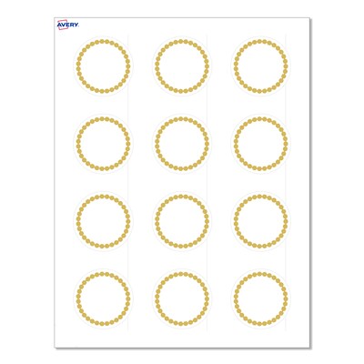 Pre-printed with beautiful designs, Avery Round 2" Diameter Matte White Labels with the Gold Beads Design help save ink and also elevate your branding and events. Pre-designed and printed with metallic gold ink with high-quality printers, these shiny patterns will definitely stand out and are not easily achieved with desktop printers. These pre-printed embellishments also help save your printer ink so that you only need to print your customizable information. Mix and match these labels with other Avery products from the same collection that have the same pre-printed design to create a cohesive look. Featuring the helpful Pop-Up Edge technology to help lift and peel labels quickly, these permanent-adhesive labels are great for product labels, care instructions labels, ingredient labels, and more. The versatile matte white material is a great solution for any project. Compatible with both laser and inkjet printers, these labels make it a breeze to personalize them with your own information with a desktop printer while still looking professional. Sure Feed technology reduces printer jams by creating a more reliable feed through your printer. Customize gold wedding labels, luxury holiday event labels, premium event labels, and festive gold labels with your own logos, text, and designs by searching for the Presta ID S00-D1J and using Avery Design & Print on the Avery site. Whether you’re a business owner that wants to add more flair to products, an event planner looking to elevate an event, or a teacher looking to step up class projects, Avery labels make it easy to translate your designs into reality.