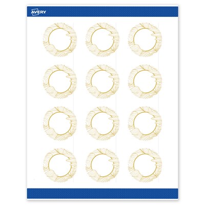 Add an elevated, professional touch to your branding or event with Avery(R) Round 2" Diameter Matte White Labels featuring the Gold Monstera Leaves design. These premium labels are pre-printed with elegant, metallic gold accents that standard desktop printers simply can't replicate, giving your business or event an instant upgrade. With a design already pre-printed, you can easily customize the blank space while using less ink—just personalize and print. For a cohesive look, pair these labels with other Avery(R) products in the same design collection. Featuring convenient Pop-Up Edge technology for faster peeling, these permanent customizable labels apply smoothly and stay securely in place. The smooth matte white finish delivers clean, versatile results that work beautifully across a wide range of projects. Compatible with laser and inkjet printers, these labels make it easy to print personalized labels with professional results. Built-in Sure Feed(R) technology is designed to provide a more reliable feed through your printer, helping to reduce misalignments, printer jams, and wasted product. Search Avery Presta(R) Template S00-EVY, and use Avery(R) Design & Print to add your own logo, text, and artwork. Our easy-to-use design software lets you add your own personal touch while enjoying the consistency of the stunning, pre-printed design.