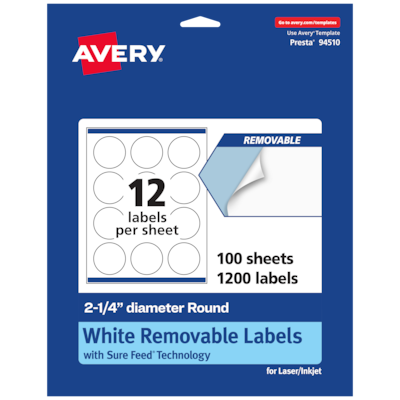 Add an elegant touch to home organization labels, price labels, mailing seals, candle labels, pricing labels, soap labels, product labels, round spice labels, mason jar labels and more with Avery 2.25" diameter Matte White Removable Round Labels. Made with matte white paper and removable adhesive, the removable Avery labels stick and stay but remove cleanly. Apply these removable white labels to smooth surfaces such as paper, plastic, cardboard, glass, or metal and peel them away without leaving behind messy residue. Avery round labels are carefully constructed with patented features to provide the best results. Sure Feed technology reduces jams or smudges by creating a more reliable feed through your printer. The print-to-the-edge layout lets you print beautiful full-bleed designs that fill each blank sticker to the edge. The Pop-Up Edge lets you fold the sheet back to pop up the edges of each label for faster peeling. The dual-compatible printable labels are compatible with both laser printers and inkjet printers. Easily customize labels with your own designs, art, symbols, and messaging in Avery Design & Print.