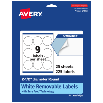 Add an elegant touch to home organization labels, price labels, mailing seals, candle labels, pricing labels, soap labels, product labels, round spice labels, mason jar labels and more with Avery 2.5" diameter Matte White Removable Round Labels. Made with matte white paper and removable adhesive, the removable Avery labels stick and stay but remove cleanly. Apply these removable white labels to smooth surfaces such as paper, plastic, cardboard, glass, or metal and peel them away without leaving behind messy residue. Avery round labels are carefully constructed with patented features to provide the best results. Sure Feed technology reduces jams or smudges by creating a more reliable feed through your printer. The print-to-the-edge layout lets you print beautiful full-bleed designs that fill each blank sticker to the edge. The dual-compatible printable labels are compatible with both laser printers and inkjet printers. Easily customize labels with your own designs, art, symbols, and messaging in Avery Design & Print. Whether you’re looking for labels to help organize your home, labels for a school project or product labels that will grab people’s attention, Avery Matte White Removable Labels are the perfect choice for any project.