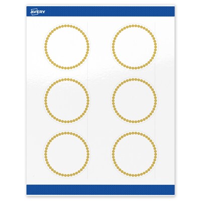 Pre-printed with beautiful designs, Avery Round 3" Diameter Glossy White Labels with the Gold Beads design help save ink and also elevate your branding and events. Pre-designed and printed with shiny matte gold ink with high-quality printers, these patterns will definitely stand out and are not easily achieved with desktop printers. Mix and match these labels with other Avery cards, tags, and name badges from the same collection that have the same pre-printed design to create a cohesive look. Featuring the helpful Pop-Up Edge technology to help lift and peel labels quickly, these permanent-adhesive labels are great for bottle labels, mason jar labels, product labels, and more. Made with a glossy white material, the reflective finish adds a professional, photo-quality look to any project. Compatible with both laser and inkjet printers, these labels make it a breeze to personalize them with your own information with a desktop printer while still looking professional. Avery premium labels are carefully constructed with beneficial features to provide the best results and allow your brand to stand out. Sure Feed technology reduces printer jams by creating a more reliable feed through your printer. Easily customize gold wedding labels, luxury holiday event labels, premium event labels, festive gold labels, and more with your own logos, text, and designs by searching for the Presta ID S00-DJ9 and using the templates and tools in Avery Design & Print on the Avery site. Whether you’re a business owner that wants to add more flair to products, an event planner looking to elevate an event, or a teacher looking to step up class projects, Avery labels make it easy to translate your designs into reality.