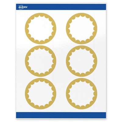 Pre-printed with beautiful designs, Avery Round 3" Diameter Glossy White Labels with the Gold Edge Dots design help save ink and also elevate your branding and events. Pre-designed and printed with shiny matte gold ink with high-quality printers, these patterns will definitely stand out and are not easily achieved with desktop printers. Mix and match these labels with other Avery cards, tags, and name badges from the same collection that have the same pre-printed design to create a cohesive look. Featuring the helpful Pop-Up Edge technology to help lift and peel labels quickly, these permanent-adhesive labels are great for bottle labels, mason jar labels, product labels, and more. Made with a glossy white material, the reflective finish adds a professional, photo-quality look to any project. Compatible with both laser and inkjet printers, these labels make it a breeze to personalize them with your own information with a desktop printer while still looking professional. Avery premium labels are carefully constructed with beneficial features to provide the best results and allow your brand to stand out. Sure Feed technology reduces printer jams by creating a more reliable feed through your printer. Easily customize gold wedding labels, luxury holiday event labels, premium event labels, festive gold labels, and more with your own logos, text, and designs by searching for the Presta ID S00-DK0 and using the templates and tools in Avery Design & Print on the Avery site. Whether you’re a business owner that wants to add more flair to products, an event planner looking to elevate an event, or a teacher looking to step up class projects, Avery labels make it easy to translate your designs into reality.