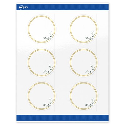 Pre-printed with beautiful designs, Avery Round 3" Diameter Glossy White Labels with the Gold Double Border with Florals design help save ink and also elevate your branding and events. Pre-designed and printed with shiny matte gold ink with high-quality printers, these patterns will definitely stand out and are not easily achieved with desktop printers. Mix and match these labels with other Avery cards, tags, and name badges from the same collection that have the same pre-printed design to create a cohesive look. Featuring the helpful Pop-Up Edge technology to help lift and peel labels quickly, these permanent-adhesive labels are great for bottle labels, mason jar labels, product labels, and more. Made with a glossy white material, the reflective finish adds a professional, photo-quality look to any project. Compatible with both laser and inkjet printers, these labels make it a breeze to personalize them with your own information with a desktop printer while still looking professional. Avery premium labels are carefully constructed with beneficial features to provide the best results and allow your brand to stand out. Sure Feed technology reduces printer jams by creating a more reliable feed through your printer. Easily customize gold wedding labels, luxury holiday event labels, premium event labels, festive gold labels, and more with your own logos, text, and designs by searching for the Presta ID S00-DMR and using the templates and tools in Avery Design & Print on the Avery site. Whether you’re a business owner that wants to add more flair to products, an event planner looking to elevate an event, or a teacher looking to step up class projects, Avery labels make it easy to translate your designs into reality.