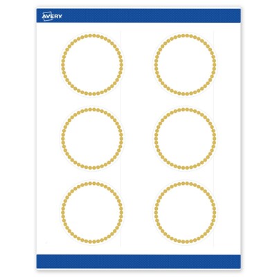 Pre-printed with beautiful designs, Avery Round 3" Diameter Matte White Labels with the Gold Beads design help save ink and also elevate your branding and events. Pre-designed and printed with shiny matte gold ink with high-quality printers, these patterns will definitely stand out and are not easily achieved with desktop printers. Mix and match these labels with other Avery cards, tags, and name badges from the same collection that have the same pre-printed design to create a cohesive look. Featuring the helpful Pop-Up Edge technology to help lift and peel labels quickly, these permanent-adhesive labels are great for bottle labels, mason jar labels, product labels, and more. The versatile matte white material is a great solution for any project. Compatible with both laser and inkjet printers, these labels make it a breeze to personalize them with your own information with a desktop printer while still looking professional. Avery premium labels are carefully constructed with beneficial features to provide the best results and allow your brand to stand out. Sure Feed technology reduces printer jams by creating a more reliable feed through your printer. Easily customize gold wedding labels, luxury holiday event labels, premium event labels, festive gold labels, and more with your own logos, text, and designs by searching for the Presta ID S00-DJ9 and using the templates and tools in Avery Design & Print on the Avery site. Whether you’re a business owner that wants to add more flair to products, an event planner looking to elevate an event, or a teacher looking to step up class projects, Avery labels make it easy to translate your designs into reality.