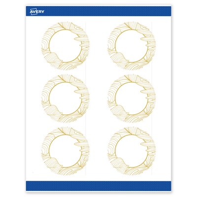 Add an elevated, professional touch to your branding or event with Avery(R) Round 3" Diameter Matte White Labels featuring the Gold Monstera Leaves design. These premium labels are pre-printed with elegant, metallic gold accents that standard desktop printers simply can't replicate, giving your business or event an instant upgrade. With a design already pre-printed, you can easily customize the blank space while using less ink—just personalize and print. For a cohesive look, pair these labels with other Avery(R) products in the same design collection. Featuring convenient Pop-Up Edge technology for faster peeling, these permanent customizable labels apply smoothly and stay securely in place. The smooth matte white finish delivers clean, versatile results that work beautifully across a wide range of projects. Compatible with laser and inkjet printers, these labels make it easy to print personalized labels with professional results. Built-in Sure Feed(R) technology is designed to provide a more reliable feed through your printer, helping to reduce misalignments, printer jams, and wasted product. Search Avery Presta(R) Template S00-EVZ, and use Avery(R) Design & Print to add your own logo, text, and artwork. Our easy-to-use design software lets you add your own personal touch while enjoying the consistency of the stunning, pre-printed design.