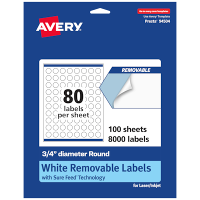 Add an elegant touch to home organization labels, price labels, mailing seals, candle labels, pricing labels, soap labels, product labels, round spice labels, mason jar labels and more with Avery .75" diameter Matte White Removable Round Labels. Made with matte white paper and removable adhesive, the removable Avery labels stick and stay but remove cleanly. Apply these removable white labels to smooth surfaces such as paper, plastic, cardboard, glass, or metal and peel them away without leaving behind messy residue. Avery round labels are carefully constructed with patented features to provide the best results. Sure Feed technology reduces jams or smudges by creating a more reliable feed through your printer. The print-to-the-edge layout lets you print beautiful full-bleed designs that fill each blank sticker to the edge. The Pop-Up Edge lets you fold the sheet back to pop up the edges of each label for faster peeling. The dual-compatible printable labels are compatible with both laser printers and inkjet printers. Easily customize labels with your own designs, art, symbols, and messaging in Avery Design & Print.