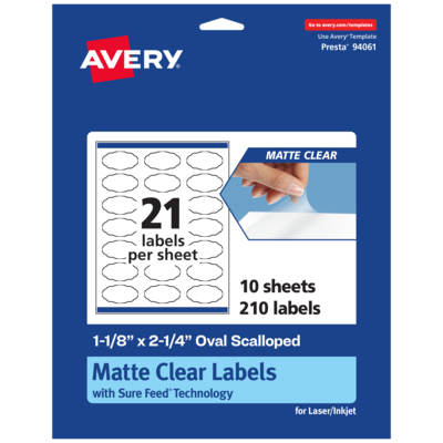 Create frosted clear lip balm labels, cosmetic labels, pricing labels, product labels, wedding and party favor labels, ingredient labels, soap labels, and more with Avery 1-1/8" x 2-1/4" Matte Clear Oval Scalloped Labels. The soft, translucent material of Avery Clear Labels is perfect for creating clear labels that blend seamlessly into lighter-colored objects and surfaces. The slightly frosted appearance also helps provide contrast to make sure your print stays legible. Avery oval scalloped labels are carefully constructed with patented features to provide the best results. Sure Feed technology reduces jams and smudges by creating a more reliable feed through your printer. The print-to-the-edge layout lets you print beautiful full-bleed designs that fill each blank sticker to the edge. The patented Easy Peel label design makes these labels easy to peel and quick to apply. Just bend the label sheet, peel off your labels and fold the sheet back flat. The strong permanent label adhesive makes sure that your labels stick and stay to a variety of surfaces without peeling, curling or falling off. Easily customize labels with your own designs, art, symbols, and messaging by using the label templates and designs on the Avery website.