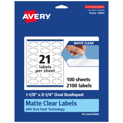 Create frosted clear lip balm labels, cosmetic labels, pricing labels, product labels, wedding and party favor labels, ingredient labels, soap labels, and more with Avery 1-1/8" x 2-1/4" Matte Clear Oval Scalloped Labels. The soft, translucent material of Avery Clear Labels is perfect for creating clear labels that blend seamlessly into lighter-colored objects and surfaces. The slightly frosted appearance also helps provide contrast to make sure your print stays legible. Avery oval scalloped labels are carefully constructed with patented features to provide the best results. Sure Feed technology reduces jams and smudges by creating a more reliable feed through your printer. The print-to-the-edge layout lets you print beautiful full-bleed designs that fill each blank sticker to the edge. The patented Easy Peel label design makes these labels easy to peel and quick to apply. Just bend the label sheet, peel off your labels and fold the sheet back flat. The strong permanent label adhesive makes sure that your labels stick and stay to a variety of surfaces without peeling, curling or falling off. Easily customize labels with your own designs, art, symbols, and messaging by using the label templates and designs on the Avery website.