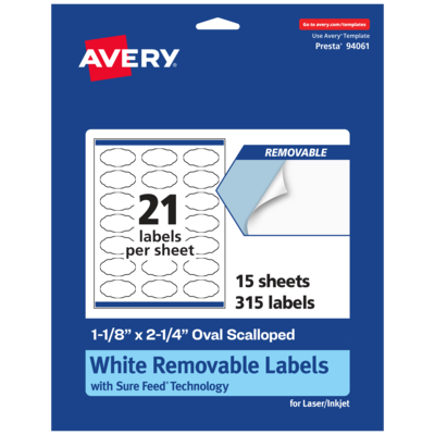 Add an elegant touch to home organization labels, price labels, food labels, beverage labels, mason jar labels, canning labels, ingredient labels and more with Avery 1-1/8" x 2-1/4" Matte White Removable Oval Scalloped Labels. Made with matte white paper and removable adhesive, the removable Avery labels stick and stay but remove cleanly. Apply these removable white labels to smooth surfaces such as paper, plastic, cardboard, glass, or metal and peel them away without leaving behind messy residue. Avery oval scalloped labels are carefully constructed with patented features to provide the best results. Sure Feed technology reduces jams or smudges by creating a more reliable feed through your printer. The print-to-the-edge layout lets you print beautiful full-bleed designs that fill each blank sticker to the edge. The Pop-Up Edge lets you fold the sheet back to pop up the edges of each label for faster peeling. The dual-compatible printable labels are compatible with both laser printers and inkjet printers. Easily customize labels with your own designs, art, symbols, and messaging in Avery Design & Print.