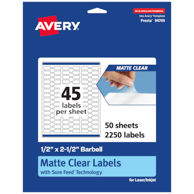 Create frosted clear jewelry labels, product seals, lip balm labels, cosmetic labels, pricing labels, product labels, cable management, and more with Avery 1/2" x 2-1/2" Matte Clear Barbell Labels. The soft, translucent material of Avery Clear Labels is perfect for creating clear labels that blend seamlessly into lighter-colored objects and surfaces. The slightly frosted appearance also helps provide contrast to make sure your print stays legible. Avery barbell labels are carefully constructed with patented features to provide the best results. Sure Feed technology reduces jams and smudges by creating a more reliable feed through your printer. The strong permanent label adhesive makes sure that your labels stick and stay to a variety of surfaces without peeling, curling or falling off. Easily customize labels with your own designs, art, symbols, and messaging by using the label templates and designs on the Avery website.