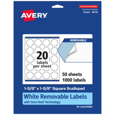 Add an elegant touch to home organization labels, price labels, candle labels, mason jar labels, pricing labels, soap labels, product labels, canning labels, ingredient labels and more with Avery 1-5/8" x 1-5/8" Matte White Removable Square Scalloped Labels. Made with matte white paper and removable adhesive, the removable Avery labels stick and stay but remove cleanly. Apply these removable white labels to smooth surfaces such as paper, plastic, cardboard, glass, or metal and peel them away without leaving behind messy residue. Avery square scalloped labels are carefully constructed with patented features to provide the best results. Sure Feed technology reduces jams or smudges by creating a more reliable feed through your printer. The print-to-the-edge layout lets you print beautiful full-bleed designs that fill each blank sticker to the edge. The dual-compatible printable labels are compatible with both laser printers and inkjet printers. Easily customize labels with your own designs, art, symbols, and messaging in Avery Design & Print. Whether you’re looking for labels to help organize your home, labels for a school project or product labels that will grab people’s attention, Avery Matte White Removable Labels are the perfect choice for any project.