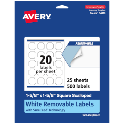 Add an elegant touch to home organization labels, price labels, candle labels, mason jar labels, pricing labels, soap labels, product labels, canning labels, ingredient labels and more with Avery 1-5/8" x 1-5/8" Matte White Removable Square Scalloped Labels. Made with matte white paper and removable adhesive, the removable Avery labels stick and stay but remove cleanly. Apply these removable white labels to smooth surfaces such as paper, plastic, cardboard, glass, or metal and peel them away without leaving behind messy residue. Avery square scalloped labels are carefully constructed with patented features to provide the best results. Sure Feed technology reduces jams or smudges by creating a more reliable feed through your printer. The print-to-the-edge layout lets you print beautiful full-bleed designs that fill each blank sticker to the edge. The dual-compatible printable labels are compatible with both laser printers and inkjet printers. Easily customize labels with your own designs, art, symbols, and messaging in Avery Design & Print. Whether you’re looking for labels to help organize your home, labels for a school project or product labels that will grab people’s attention, Avery Matte White Removable Labels are the perfect choice for any project.